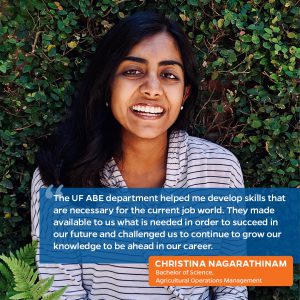 Today’s graduating student spotlight is Christina Nagarathinam! Christina is graduating with her Bachelor of Science degree in Agricultural Operations Management. During her time at the University of Florida, Christina gained great community who helped during her education journey. After graduation, Christina will be pursuing her graduate degree. Read more about Christina’s UF ABE experience this Q&A.