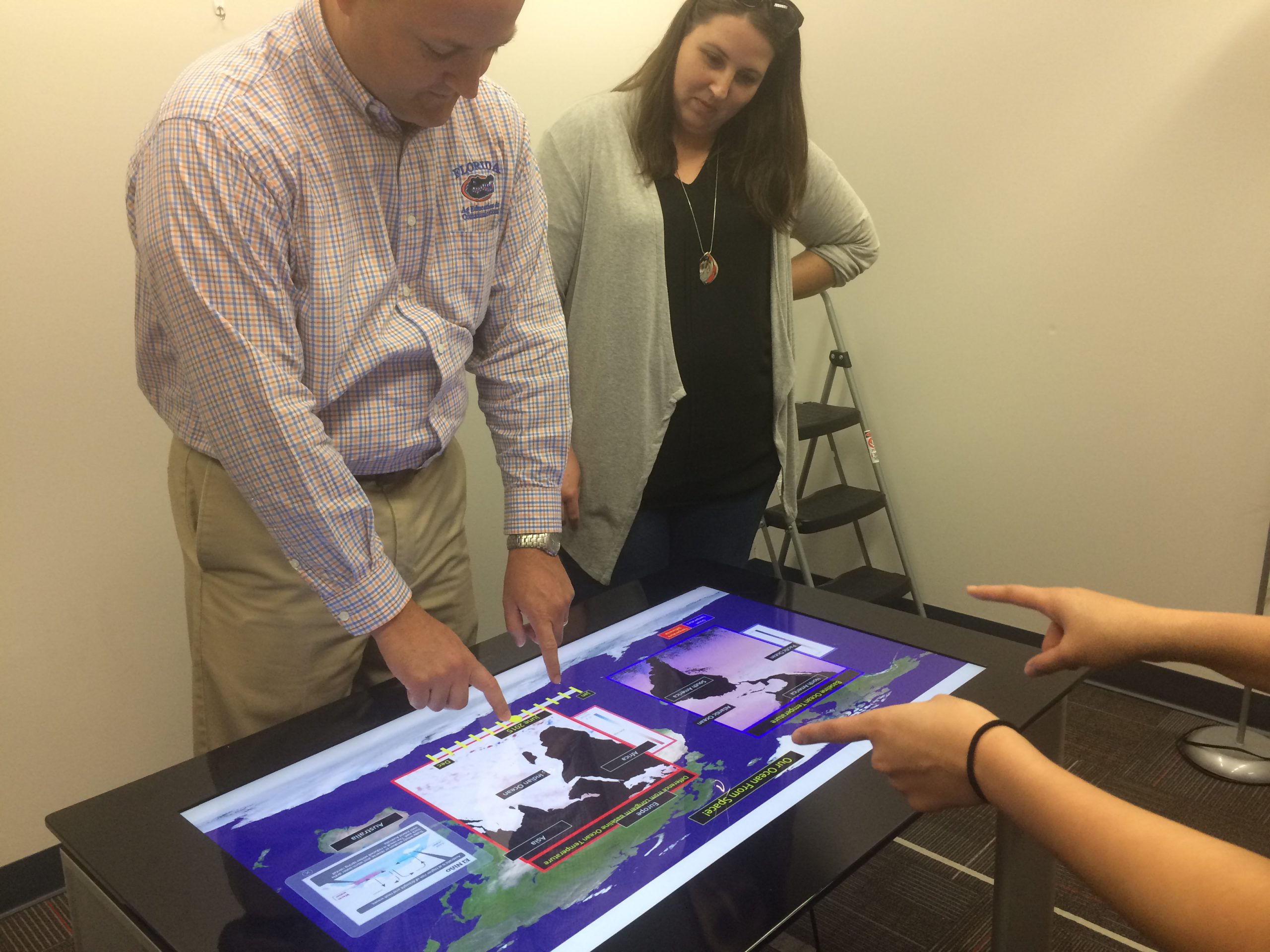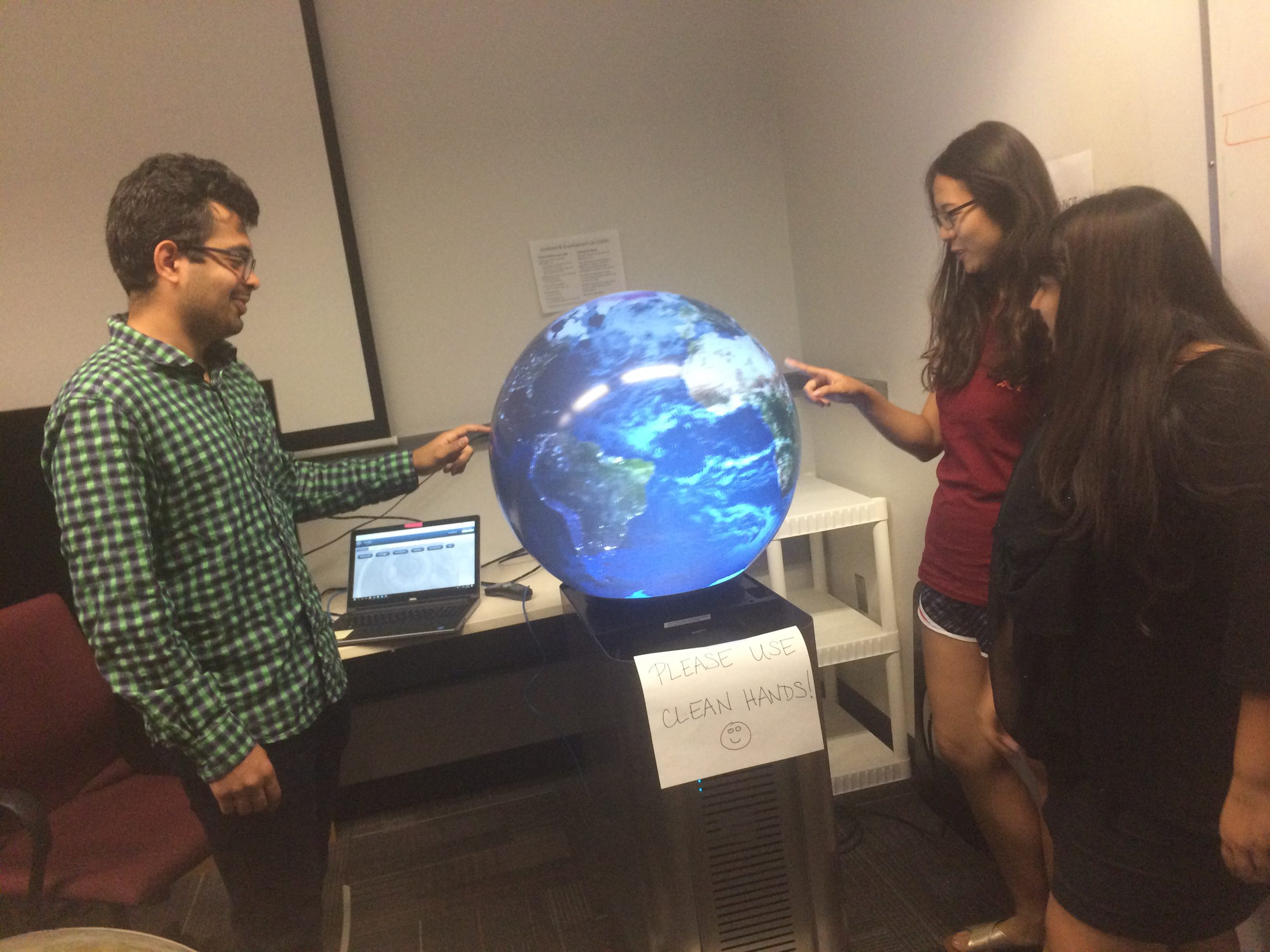 The Spring semester is complete here at the University of Florida and so is the setup of our interactive spherical display from Pufferfish Ltd. To celebrate the completion, the TIDESS team hosted an open house for members of the University of Florida to come and interact with both the spherical display demos and the tabletop prototype we have been working on.