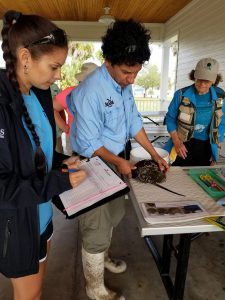 The Florida Horseshoe Crab Watch citizen science program was created because of the lack of knowledge about the horseshoe crab population in Florida. The program started in Cedar Key by the University of Florida (Department of Biology, UF IFAS Nature Coast Biological Station, and Florida Sea Grant) and FWC’s Fish and Wildlife Research Institute in 2015. The program takes advantage of the beach nesting behavior of horseshoe crabs to collect valuable information. Volunteers walk a known section of beach at predetermined times and count the number of horseshoe crab mating groups observed. A small subset of crabs are collected, measured, tagged with a small numbered disc, and released back into the wild. Reports of tagged horseshoe crabs help track crab movements and reappearances on beaches.