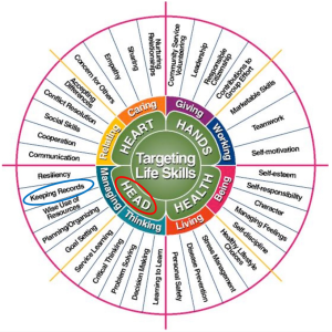 On the 4-H Targeting Life Skills wheel, record keeping falls under the “head” category, emphasizing cognitive skills and resource management, including better time, resource, and talent utilization. (Click the graphic to expand.)