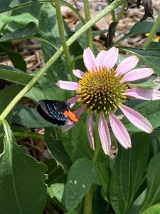 As a community center, the Smart Rain Garden and Veterans Memorial Park is a shady space to walk a dog, meet with friends, enjoy the outdoors, observe surprising wildlife (Figure 1), and join a community event, like weeding or pollinator monitoring. Observations by NSF Team members and community members alike have uncovered an uptick in plant and animal biodiversity.