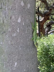As the lush, mounding grasses and various flowering plants filled in the slopes and dips of the bioswale this summer (Figure 2), many pollinating insects arrived and stayed to join the resident birds, squirrels, and lizards. This includes the endangered Atala butterfly (Figure 3) and others like the orange Monarchs and yellow Sulphurs, alongside strikingly iridescent metallic bees. Also enjoying the Rain Garden are some exotic invasive critters such as the vibrantly green, tree-dwelling Cuban Knight Anole (the largest anole in the world) (Figure 4) and the Bahamian Curly Tail Lizard, a ground dweller.