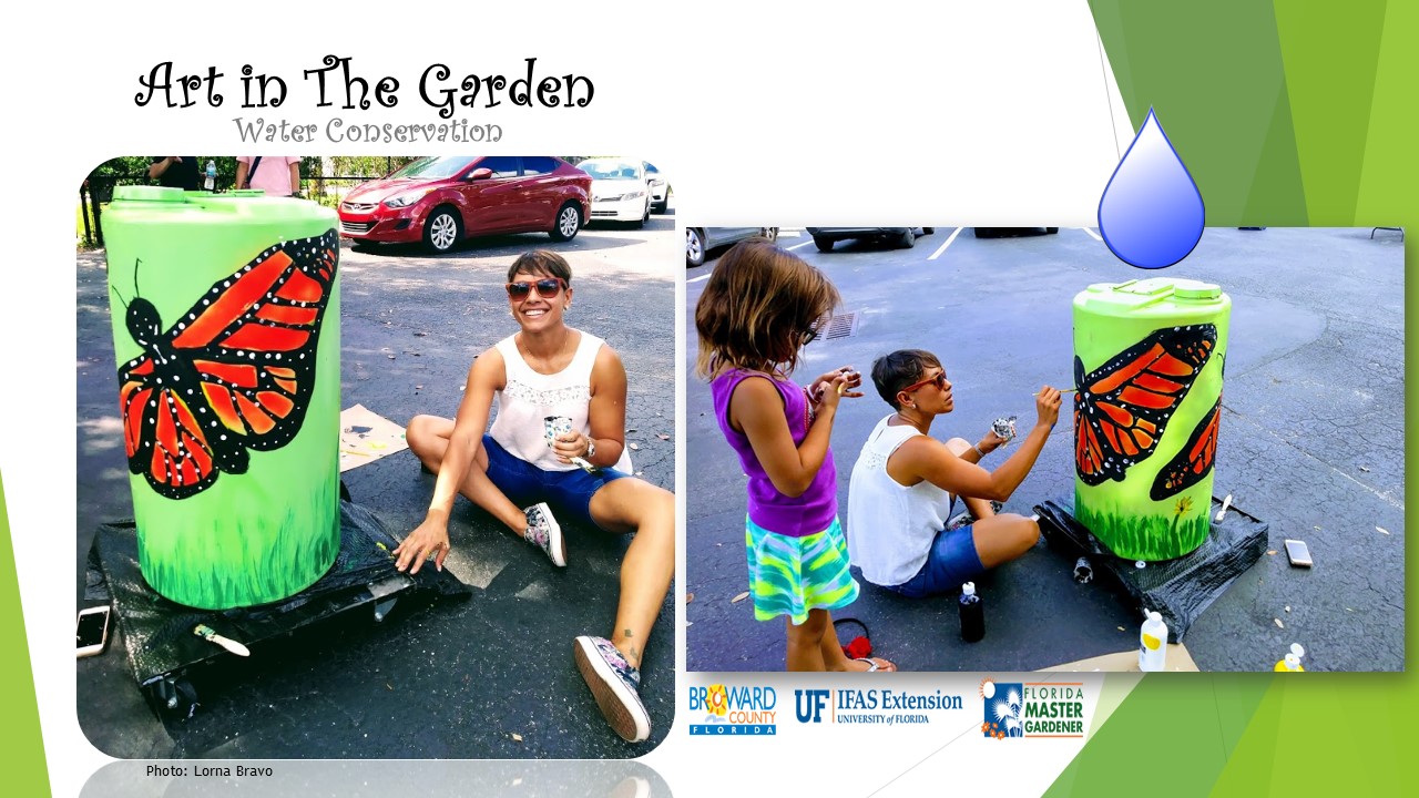 Did you know that South Florida received an average of 62 inches of rainfall per year? Most of this water washes off lawns and pavements carrying fertilizers and other chemicals into local waterways. You can capture and use our abundance of rain. During Art in The Garden, families will learn water conservation practices with rain barrels, how to build and pur