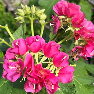 Dombeya “Seminole” only blooms during short photoperiods. It will bloom until the days start to get longer again on March 21st. Also known as Florida Hydrangea, this beautiful shrub is a reliable winter bloomer here, Easy to grow, Dombeya is much appreciated for its color and as food for pollinators.