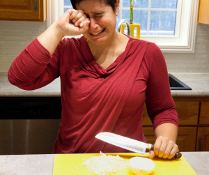 How can you reduce tearing when cutting an onion? To reduce tearing, chill the onion(s) for 30 minutes. Then, cut off the top and peel the outer layers leaving the root end intact. (The root end has the highest concentration of sulfuric compounds that make your eyes tear.) https://fruitsandveggies.org/fruits-and-veggies/onion/