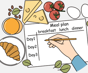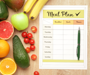 1. Create a weekly meal plan. This will help show you what you need and can also help determine what you don’t need. Start with a chart of the days, three mealtimes and snacks, and list the menus for each day.
