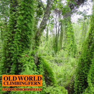 The aggressive fern is nonnative and invasive in the state of Florida. It invades moist habitats in South Florida and spreads rapidly without the need of habitat disturbance. Forming dense canopies, the Old World climbing fern also serves as a fire ladder carrying fire to native tree canopies that would not burn under normal conditions. Although this invasive mostly invades public conservation lands, it also can invade residential areas. Each plant releases thousands of spores and are carried by wind, dust, animals, clothes, and equipment.