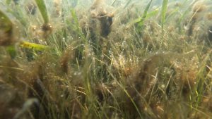 Another product of decomposition is carbon dioxide, which is what carries the cyanobacteria mats up to the surface. This is same process that causes soda bubbles to rush to the top of bottle when you take the top off. As benthic cyanobacteria mats float to the surface, they may also pull seagrass blades out of the sediment.
