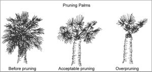 When pruning palms, proper pruning guidelines should be followed. Over-pruning palms can make them susceptible to pests and diseases. Additionally, because palms have unique nutritional requirements and they tend to recycle many of their nutrients from older growth to newer growth, over-pruning palms can also result in nutrient deficiencies. When pruning palms, only spent flower stalks, immature fruit, and brown fronds should be removed. Click on the link to learn more about pruning palms.