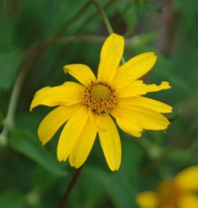 The Heliopsis genus (also known as ox-eye daisy and false sunflower) is native to North America and often admired by horticulture buffs for its showy petals. The plants also attract birds and pollinators. Its perennial growth cycle, and low maintenance requirements lend easily to landscape mass plantings. The genus can also be used as cut flowers. For many species, blooming occurs mostly from summer through autumn. As with other plants in the Asteraceae (Compositae) family, clusters of achenes (fruit) replace flowers once the blooming season is over.