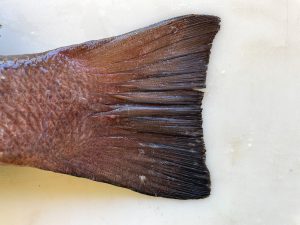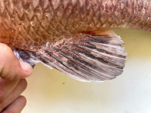 This method of ID may be difficult to conduct with live fish as they may be snapping their teeth so it’s great to familiarize yourself with some other characteristics of each species although less definitive. The gray snapper’s teeth are smaller but also closer together than the cubera’s larger spaced-out canines.
