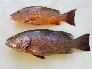 The exact calendar months which spawning occurs in this species can vary across cubera’s range but these fish reproduce during the late spring to late summer with peak activity in Florida occurring in June and July. The lunar cycle plays a role with spawning however peak spawning activity does not always occur with highest catch rates for a variety of hypothesized reasons. One thought is that full moon conditions can make fishing tackle more visible, deterring the bite of these nocturnal predators. Another hypothesis is that pre spawning female fish may have reduced feeding activity because of their gonads filled with eggs physically adding pressure on their digestive system. As a result, fisheries dependent catch data for spawning activity varies throughout the lunar cycle and between sexes. One 2016 published study of acoustically tagged cubera snapper in the US Virgin Islands recorded a high number of detections of fish visiting spawning sites a week before and a week after the full moon between the months of May-November. Spawning in cubera is cued by multiple factors including water temperature, time of day and lunar cycles with observations of spawning behavior occurring around sunset. Cubera are mostly a solitary species however during spawning season this species forms large aggregations dozens to hundreds of individuals near structures such as deep water shelves, reefs and wrecks. When spawning, small groups of 3-6 fish break off the larger aggregation, rise in the water column and descend back down releasing eggs and sperm. The buoyant eggs hatch within 24 hours and newly hatched larvae drift the water column for ~29 days before resembling a more familiar fish form and settling into their juvenile habitat. Cubera can become reproductive at 4-5 years old which correlates to 21.5 inches in total length. This species can grow rapidly for the first 12 years of their lives. In a 2017 publish paper of 106 aged fish the average size for a 5-year-old cubera was 27.7 inches; however, fish over 39 inches had variable ages of 11 to 55 years. This variability with size and age is common with longer lived large reef fish.