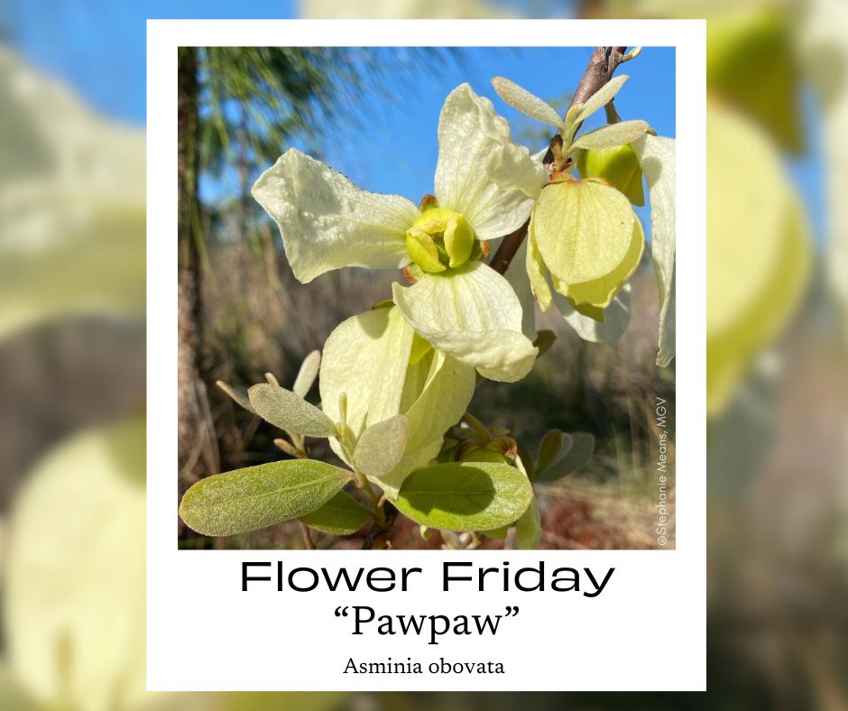 Showing off right now in our natural areas, the unusual and alluring scrub pawpaw flower stops you in your tracks.