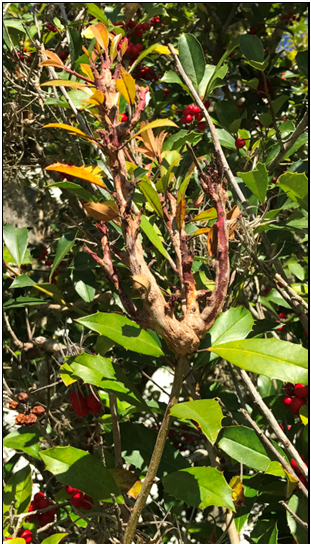 Sphaeropsis Gall is a disease that has been slowly increasing in our landscapes. It is a disease that affects hollies. The reason for the increase is not that the disease is changing, it is that we are starting to use more and more holly in the landscape. Most of our hollies are susceptible. The disease is first noticed when the leaves at the end of branch tips turn yellow. Then as the disease progresses the branches start to become thicker than the surrounding tissue. In advanced cases a witches broom forms on the diseased branch. Eventually, the diseased branches will die. While this disease can be spread naturally with rain splashed spores, transmission from tree to tree can be reduced by ensuring our pruning tools are clean.
