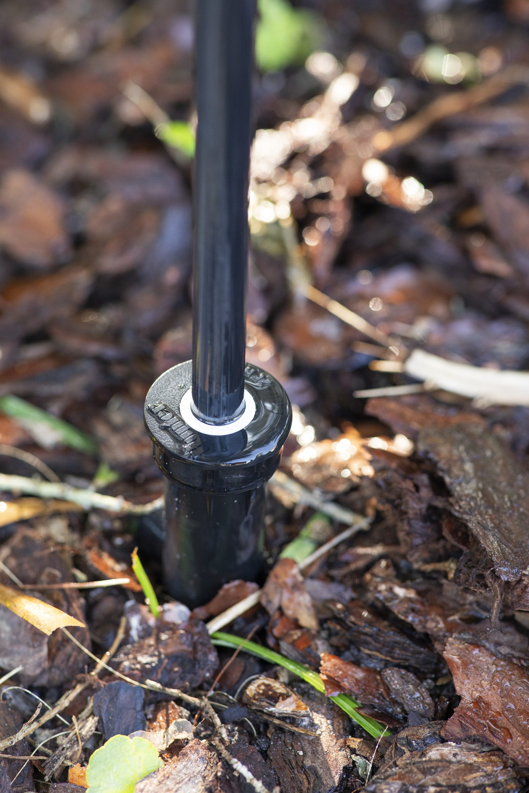 Problem: Irrigation head obstructed by a rain barrel. This irrigation head needs to be moved now that a rain barrel has been installed. Photo Credit: Stephanie Means