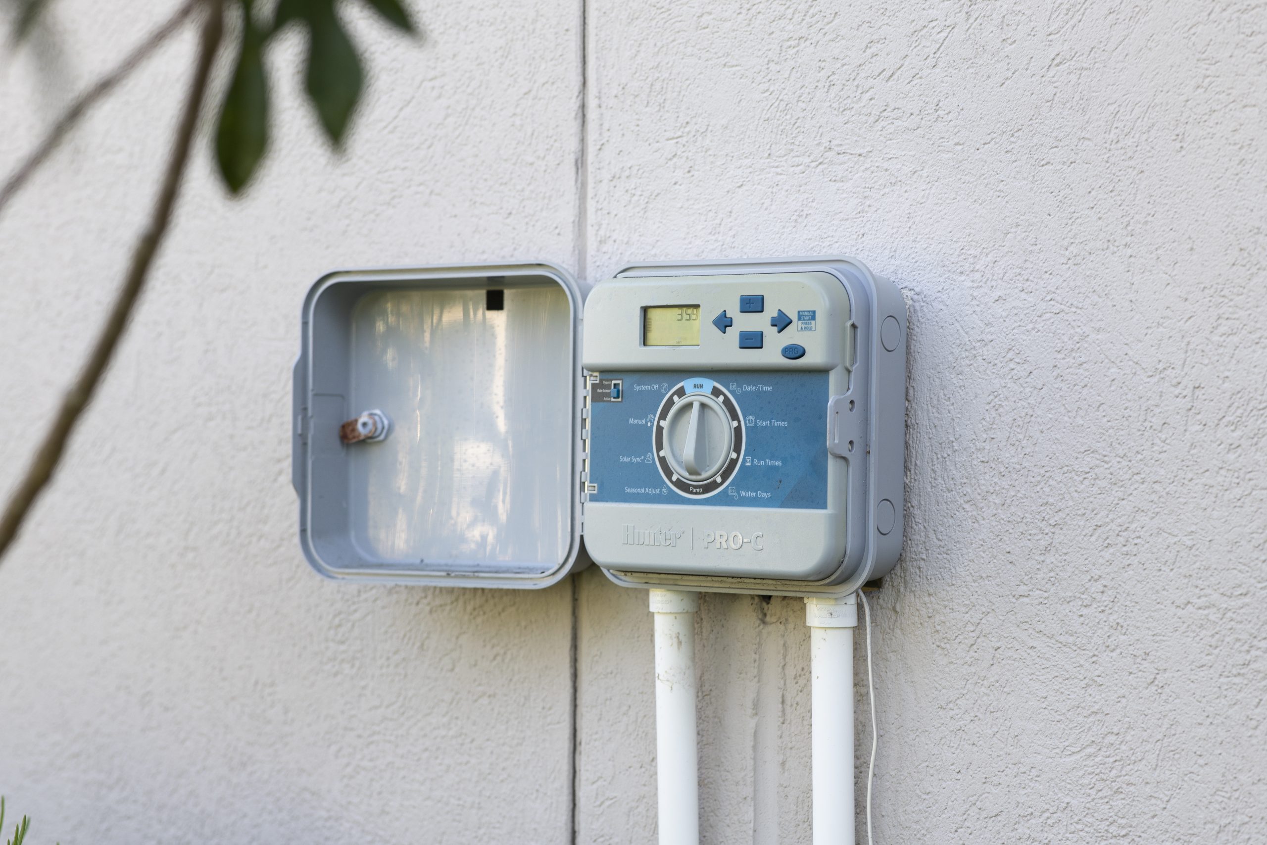 A typical irrigation controller. Often located in the garage or on an outside wall of the house. Photo Credit: Cat Woffard UF/IFAS