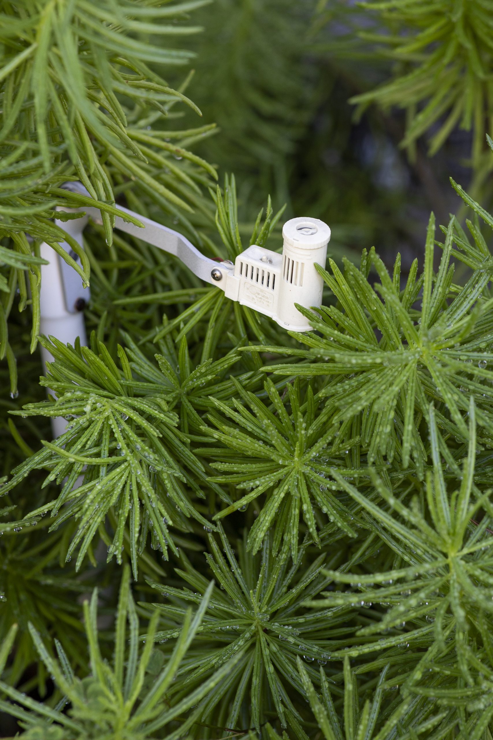 Close up of rain sensor located in the shrub. Photo Credit: Cat Woffard UF/IFAS