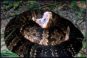 - another warning behavior is mouth gaping and showing of white mouth- “cottonmouth”; though strike probability is still low, studies show that gaping cottonmouths tend to strike more often than tail vibrating ones – DO NOT APPROACH; move back and allow the snake to pass