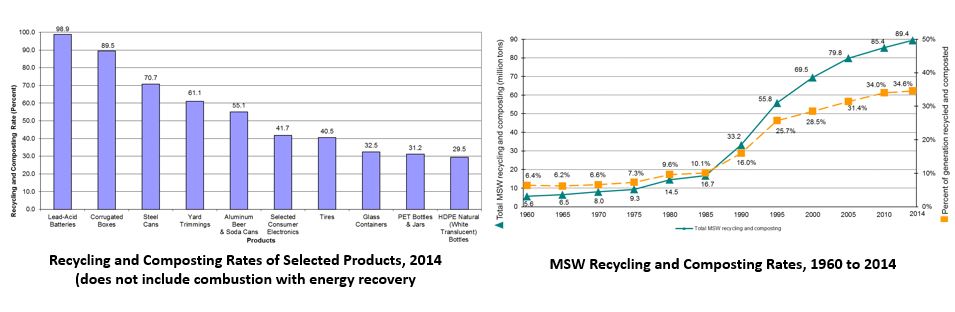 According to the U.S. EPA, 258 million tons of municipal solid waste was generated in the United States in 2014. 89 million tons (34%) was recycled. This is an increase from the 30% reported in many environmental science textbooks 10 years ago and <20% 20 years ago. Some states are doing much better than the national average, Washington reports they are now recycling 51.4% of their solid waste, and some nations are recycling more than 90% – so things are improving but there is room for improvement.