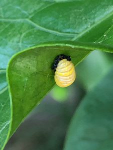 Just recently, I got to personally witness part of the ladybug (also known as a ladybird beetle) life cycle I had never seen. One afternoon, I noted multiple larval and adult ladybugs on a hibiscus plant in my backyard. One of the larvae, however, had appeared to attach itself to the underside of a leaf. As I watched, it started making whole-body wiggling motions from the bottom up, almost as if it was trying to pull on a pair of tight pants. In under one minute, a thin yellow quasi-shell moved from the bottom of the larva towards the head. It was suddenly still, bright yellow, and looked almost like a light-colored adult ladybug. I was baffled at how quickly the transformation happened—it basically excreted a brand new exoskeleton before my eyes. Returning an hour later, the insect was gone—the new adult left its pupal form behind.