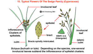 These three types of herbaceous plants can be differentiated by feel, including the shape of their stalks/blades in cross section. A sawgrass plant, if rolled between your fingers, has noticeable edges in an almost triangular shape.