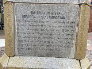 We launched our kayaks from the middle of downtown Plainwell, Michigan, a tiny suburb of Kalamazoo located along the Kalamazoo River. Once a watery highway for Native American tribes, the river name likely comes from an Algonquin word for “boiling water” due to the mild rapids along the river course. Frozen stretches at the northern reach of the river were sources of ice and drinking water for indigenous people.
