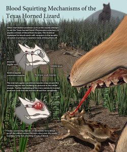 Perhaps the coolest and weirdest feature of Texas horned lizards is their arsenal of defense mechanisms. While their spikes would certainly deter many would-be predators, they also produce a toxin that tastes bad to dog species. This seems likely a result of co-evolution with desert coyotes, although their predators include snakes and large birds of prey. The toxins, present in the skin, are also circulated in their blood. When picked up or in peril, the lizards can literally squirt blood from their eye sockets to fend off predators. This technique quite obviously confuses and scares an animal threatening the lizard. This year’s TCU football uniforms even featured a nod to that bloody technique, with a red-tinged alternate “spit-blood” uniform worn during their game against Oklahoma State.