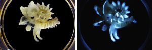 Recent studies have investigated the worms’ ability to create and sustain a bioluminescent blue light within their mucus layers. Most bioluminescent organisms flash or have temporary lighting, but researchers have discovered that the presence of a form of iron called ferritin serves like an energy-storing battery. As the chemical pathway of this phenomenon is studied, it may yield new ways on how to create more effective rechargeable (and biodegradable) light sources for commercial or medical applications. Functionally, researchers are split as to why the worms produce such a glow. Theories include the idea that this sustained light may function to lure in potential food sources, or conversely as a sort of “burglar warning” that wards off predators. Like many other worms, parchment tube worms can regenerate segments if they are lost during predation.