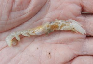 Ghost shrimp (Callichirus islagrande, most likely in our area–but there are hundreds of species) are small, (3-4” long), skinny, cryptic organisms that build deep (3-4 feet) individual burrows underwater and in the swash zone of the beach. These burrows serve as hiding places from would-be predators. The shrimp themselves use small abdominal paddles to move water through their burrows, picking up algae and small bits of detritus to eat. The name ghost shrimp comes from their light pigmentation and minimal shell calcification–both features they can dispense with when living deep underground. These invertebrates play an important role in nutrient provision and movement on beaches, bringing organic material deep under the sand, transforming it, and moving it to the surface.