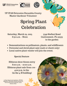 If you’ve never been, this Saturday, March 29, is the perfect time to visit! Our Master Gardener Volunteers will be hosting a “Spring Plant Celebration” at the Demonstration Garden from 8:30 am-4:00 pm. They will have a perennial and shrub plant sale (cash/check only) and will host demonstrations on pollinators, plants, and wildflowers. For more information on the garden and horticulture program, contact our Horticulture Agent, Beth Bolles at 850-475-5230 or bbolles@ufl.edu.