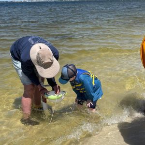 Our typical morning on the water consists of a stop at Project Greenshores, where I’ll explain the history and purpose of this large-scale living shoreline. Then, we skip across Pensacola Bay to Deadman’s Island, where kids get some hands-on marine biology experience. We use a seine to catch (and release) juvenile fish, giving every camper a chance to use the net if they’re interested. Typically, we find silversides and pinfish, but often there are fun and less common species like toadfish, needlefish, and flounder. We use a yabby pump to pull invertebrates from the underlying sand—usually worms or amphipods. Underwater viewers that function like swim goggles allow kids to wade around and see below the water as if they were snorkeling. On practice days, we will watch the Blue Angels’ acrobatic maneuvers as they soar above us. We almost always see dolphins; one morning we saw six, including a show-off who leapt fully out of the bay and turned a flip!