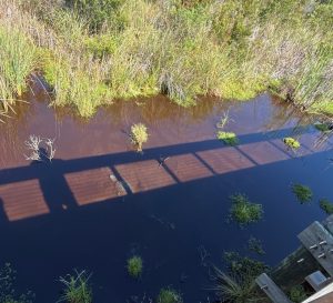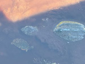 If you’re ever looking for an easy nature walk with guaranteed wildlife sightings, I highly recommend the Gulf Breeze Wetlands Trail. It’s a little over a ¼ mile long boardwalk trail at Shoreline Park South, overlooking a marsh that transitions from freshwater to saltwater. We went there over Labor Day weekend to enjoy the nice weather, and enjoyed seeing the locals—a large blue heron, an osprey diving for fish, and a handful of turtles paddling around. There’s an open pool below a bridged section of the trail where lots of turtles congregate, no doubt hoping for snacks from visitors. My favorite, though, was the algae-covered alligator snapping turtle (Macroclemys temminckii). This big fellow—at least two feet long—stood out from the crowd. His bulky head was larger than most of the surrounding turtles’ shells.