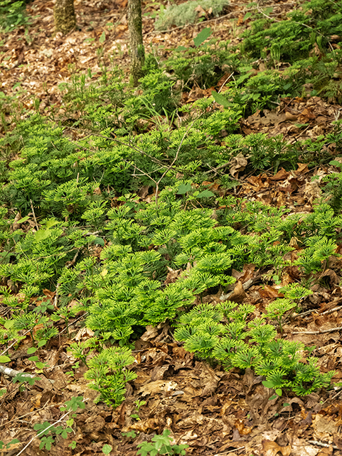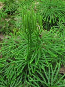 The “club” in clubmoss comes from structures that grow up and out of the low-growing moss, called strobili. Spores, produced in sporangia packets, grow in the club-shaped strobili. The plant is particularly notable in the hardwood forest during the deep midwinter, when other plants have dropped their leaves and the fan clubmoss is evergreen. This trait has left it vulnerable to collection, especially for Christmas décor, which is highly discouraged now.