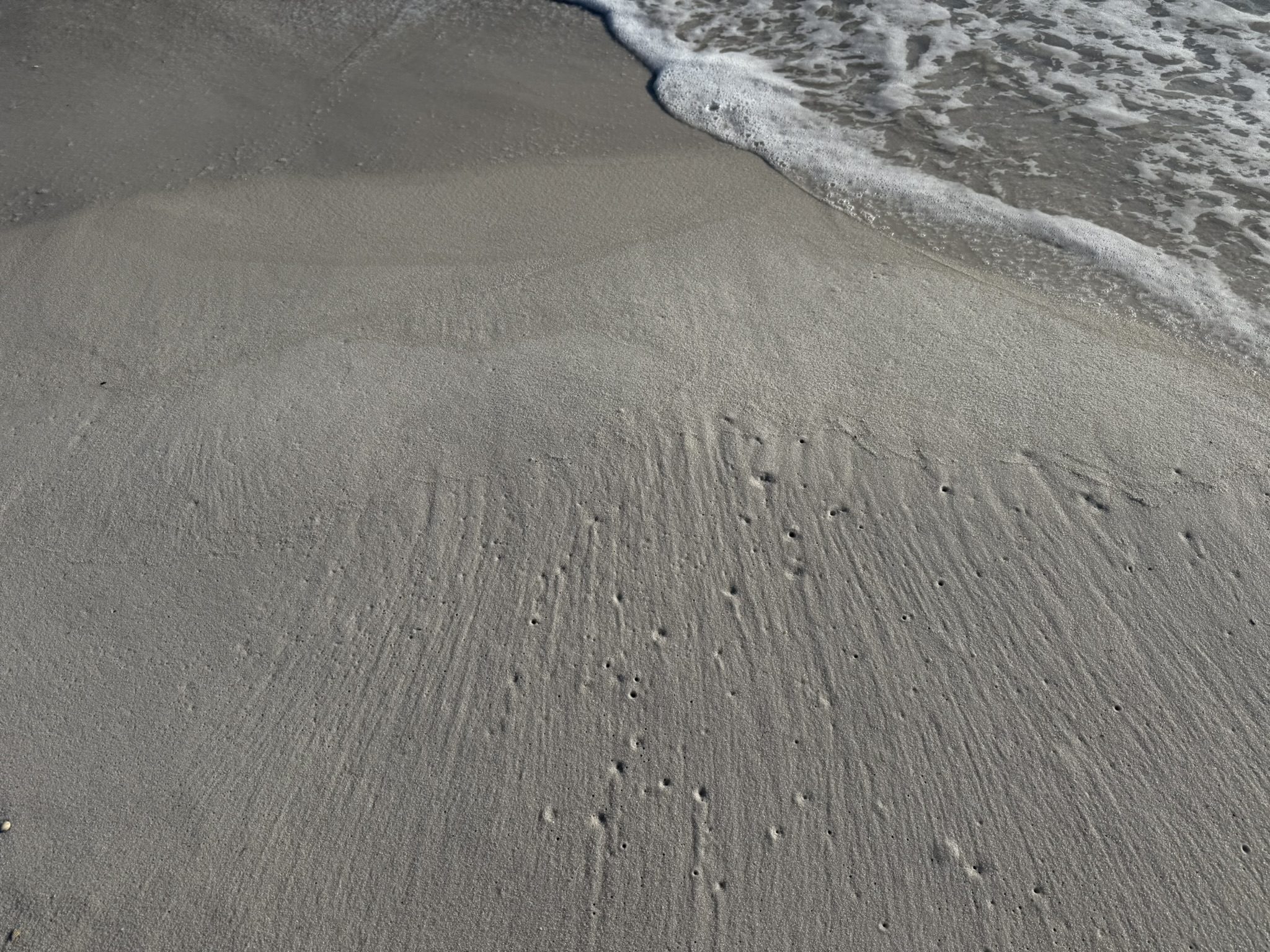 Like other bivalves—oysters, scallops, mussels—coquinas are filter feeders. They use tiny incurrent siphons to suck in water, which moves over little basket filters or gills that pick out detritus, plankton, and other tiny food particles suspended in the water. Cilia—tiny hairlike projections—move the food into the organisms’ stomachs. Water then leaves through an excurrent siphon, and the process starts all over again. This causes those little air pockets you see as you walk.