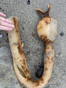 We also came across larger, 3” diameter pieces of fleshy bull whip kelp (Nereocystis luetkeana) strewn along the beach. It looked and felt exactly like thick rubber tubing.