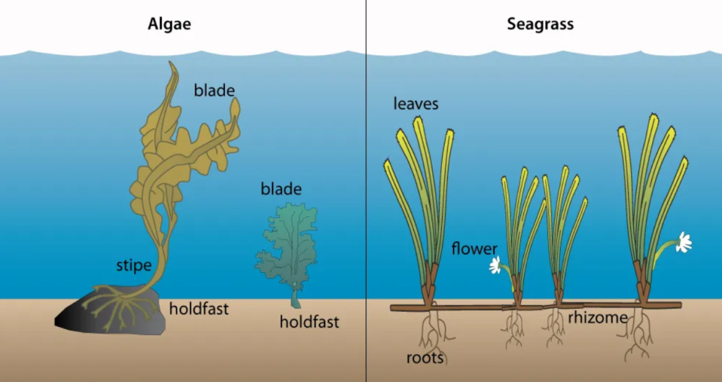 On behalf of the biologists and botanists in my audience, I will remind readers that there is an important difference between seagrass and seaweed. While the terms are often used interchangeably, seagrass is an actual plant, rooted in the sea bottom, producing leaves and flowers like any terrestrial flora. Seaweed is algae—an organism that looks and functions much like a plant (including photosynthesis) but differs in several important ways. Macroalgae may come in red, green, or brown varieties, and do not have root systems to absorb nutrients like seagrass. Kelp, a brown algae, is instead attached to the rocky seafloor by a holdfast. It has no internal vascular system to distribute nutrients, instead absorbing them from the surrounding water by diffusion.