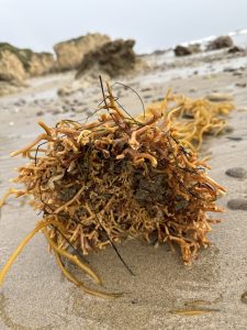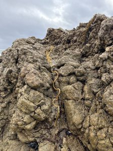 Giant kelp is a remarkably fast grower, recorded in ideal conditions at lengthening 18” per day. Its anatomy is quite interesting. The whole organism is called a thallus, which is composed of a holdfast, blades or fronds, air bladders, and stipes (flexible stems). While on the beach in California, we came across all of these interesting pieces and shapes. The blades lined in pneumatocysts (air bladders) reminded me of seeing pieces of sargassum on our local beaches. We also found holdfast chunks broken up in the surf and pushed to the beach. Among the rocks were the vinelike strands of stipes, which resembled tentacles more than plant matter.