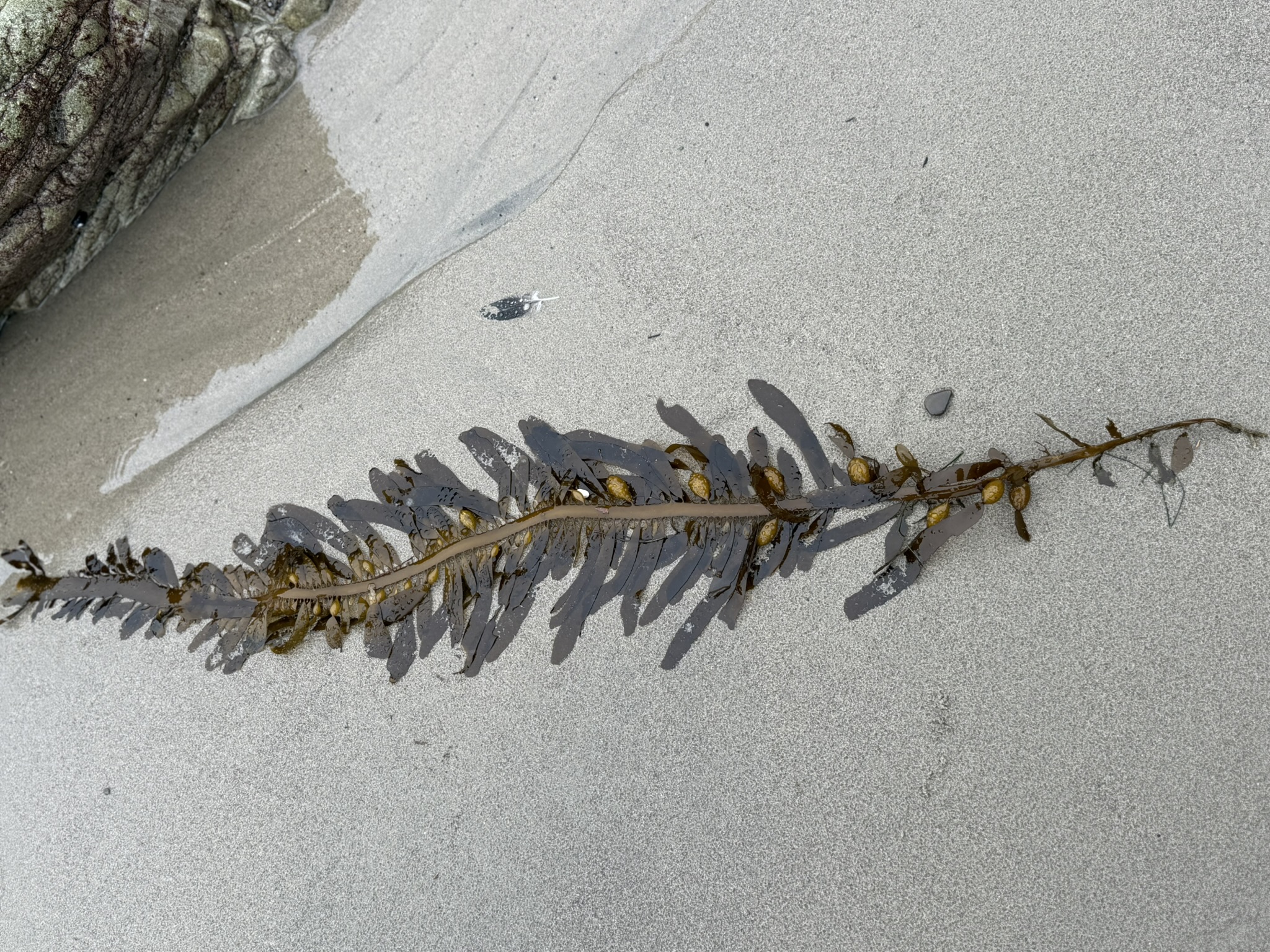 Giant kelp is a remarkably fast grower, recorded in ideal conditions at lengthening 18” per day. Its anatomy is quite interesting. The whole organism is called a thallus, which is composed of a holdfast, blades or fronds, air bladders, and stipes (flexible stems). While on the beach in California, we came across all of these interesting pieces and shapes. The blades lined in pneumatocysts (air bladders) reminded me of seeing pieces of sargassum on our local beaches. We also found holdfast chunks broken up in the surf and pushed to the beach. Among the rocks were the vinelike strands of stipes, which resembled tentacles more than plant matter.