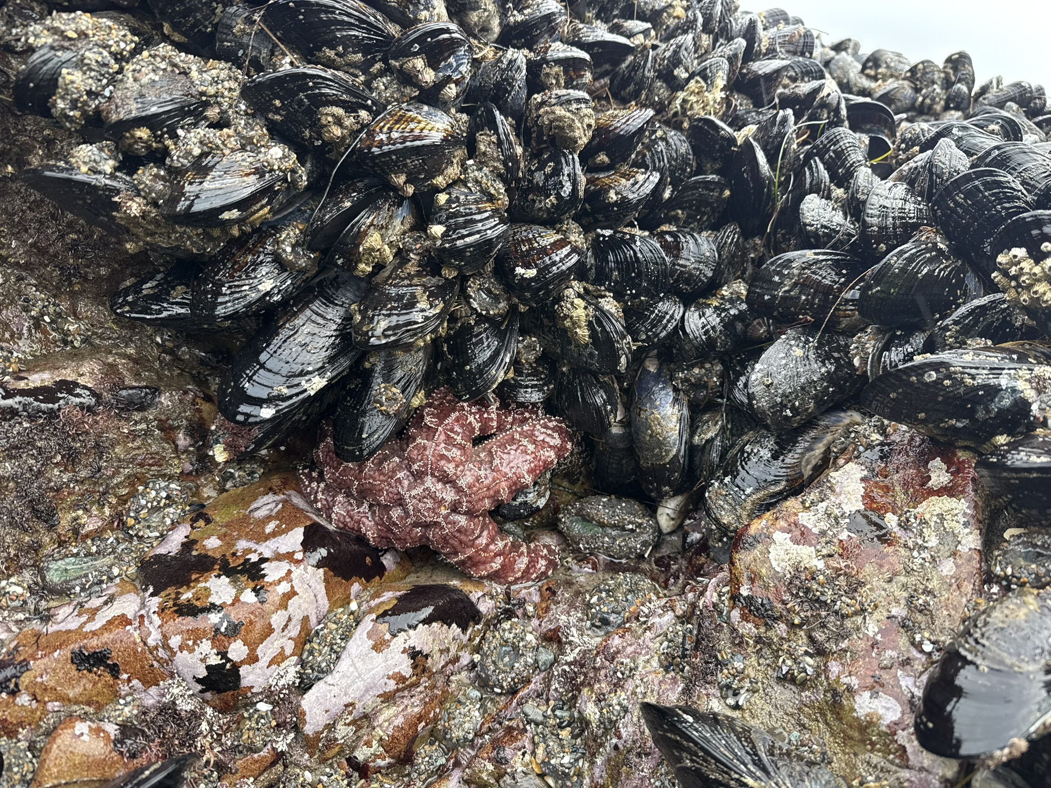 An ochre sea star feasting on a buffet of mussels. Photo credit: Carrie Stevenson, UF IFAS Extension