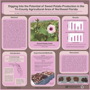 Situation: Crop diversification is vital to the sustainability of food systems. The Tri-County Agricultural Area (St. Johns, Putnam, Flagler) of Florida leads the state in production of potatoes (Solanum tuberosum L.), with Hastings being the official “Potato Capital” since 1908. However, in recent years potato growers have been operating on low profit margins, and production acreage is declining. In response, growers are looking for alternatives such as sweet potato (Ipomoea batatas L. Lam.) to diversify their farming systems and enhance sustainability. Information about sweet potato production in the area is lacking, and growers are relying on UF/IFAS Extension to help get the information needed. Methods: Field trials were conducted at the Hastings Agricultural Extension Center from May to September 2016 to evaluate yield, identify the optimal nitrogen (N) rate, and compare row spacing on selected cultivars. ‘Boniato,’ ‘Burgundy,’ ‘Covington,’ and ‘Palmetto’ were planted using two row spacings (40” and 80”) and four N rates (lbs/A) (0, 60, 90, 120). Results: Yields were significantly different for the four tested cultivars. ‘Boniato’ was the greatest yielding followed by ‘Burgundy,’ ‘Palmetto,’ and ‘Covington.’ The 90N rate resulted in the greatest yields for all cultivars. Due to insufficient slips, only the 40” row spacing was evaluated. Conclusions: Although ‘Boniato’ and ‘Burgundy’ had greater yields, ‘Palmetto’ may demand a better price with a promising market potential for Florida because of its high content of purple anthocyanin, an antioxidant that not only makes this sweet potato a superfood, but gives it an alluring purple color. Among the nitrogen rates, 90N had the best yield and nitrogen use efficiency. Thus, 90N may be considered as an appropriate nitrogen application rate for sweet potato production in the area.