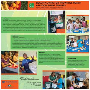 Situation: Child hunger is a critical issue, nationally and locally. According to the United States Department of Agriculture (USDA), more than 15.8 million children are experiencing hunger. Of the 102,665 youth between the ages of 5-19 years, 45.6% (29,592) of Seminole County youth are receiving Free or Reduced Lunch and (15.7%) 16,145 Seminole County youth under the age of 18 are considered to be in poverty (2014, Seminole County Kids Count Data). The objective of the United Healthcare 4-H Food Smart Families Program in Seminole County was for 70% of youth (8-12 years) to increase their understanding of preparing healthy meals at home while utilizing critical thinking skills when making food selections at the grocery store. Methods: The program consisted of: 1) educating families on the importance of nutrition, food preparation and budgeting skills and 2) equipping families with nutrition assistance resources in their local community. In 2016, the program was delivered to 118 youth through a series of (4) two hour lessons emphasizing understanding nutrition labels, consuming whole grains and fresh produce, incorporating daily physical activity, etc. Upon completion of the program, youth participated in a mock grocery store experience to demonstrate choosing healthy foods for a meal on a budget. Additionally, families received food preparation tools and gift cards to implement healthy meal preparation at home. Results: Upon completion: 89% (106/118) of youth self-reported a desire to prepare more healthy meals at home vs. fast food and demonstrated an understanding of how to use the “My Plate Model” for meal preparation while, 72% (85/118) indicated they planned to be physically active for at least 30 minutes per day. Conclusion: Program participants have demonstrated a propensity and understanding in choosing healthier meal options, preparing more meals at home and incorporating daily physical activity.