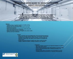 Situation: In 2012, the rate of jail admissions in Florida was just under 6,000/100,000, slightly higher than the national figures (Vera Institute of Justice). The average length of stay in Osceola County was 30.6 days, and has not changed much since then (Osceola County Corrections Volunteer Orientation). In the county, some inmates have access to such privileges as snack purchases from commissary and educational programs. However, they lack the opportunity for physical activity, getting about 20 minutes per week of recreation time. Educational programs are offered to most inmates, but are especially valued to those inmates who receive “gain time” – time off of their sentence. Methods: The types of programs taught over the past six years have included both series-based and single instruction formats for wellness education. Single instruction wellness classes are delivered once every other month. Results: Wellness series’ have shown more success than single instruction, with over 90% of inmates showing knowledge gain. The same results are lacking with single instruction classes. Conclusion: Results have been promising, but showing behavior change in the jail can be an important indicator of the choices they may make upon release. Inmates enrolled in a series have multiple times to receive and practice the information they learn in class; whereas classes held every month are most often taught to different inmates, making evaluation more difficult. Therefore, wellness classes will be series-based again to catch this information. Other types of class formats may also be beneficial, for example, pairing nutrition and physical activity, and nutrition and gardening. These formats will be explored and evaluated.