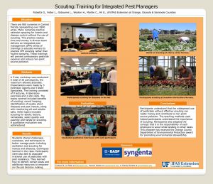 Objectives: There are 900 nurseries in Central Florida representing over 5500 acres. Many nurseries practice calendar spraying for insects and disease control without the use of scouting. This practice wastes time and money. A diverse team delivers an integrated pest management (IPM) series of trainings to educate workers to practice IPM scouting rather than routine spraying. These trainings will prevent unnecessary pesticide expense and reduce non-point source pollution. Methods: A 3-day workshop was conducted. A total of 25 participants, the maximum allowed attended. Presentations were made by 3 Extension Agents and 4 State Specialists. The training consisted of 9 lectures, 4 laboratory exercises and 2 site visits. The topics covered included benefits of scouting, record keeping, identification of weeds, plant diseases and pest insects, along with monitoring pH and soluble salts. Other topics included scouting for abiotic factors, nematodes, water quality and quantity and hands-on scouting. A qualitative evaluation was administered. Results: Students shared challenges, successes, and techniques to better manage pests including sanitation and scouting for insects and diseases, techniques learned in the class. Participants were also able to associate irrational use of pesticides with pest resistance. They learned how to identify certain pests and additional resources to empower on-the-job decision making. Conclusion: Participants understand that the widespread use of pesticides without effective scouting can waste money and contribute to non-point source pollution. The teaching methods used helped participants understand the importance of scouting. Participants also adopted the concept that it is the responsibility of each employee to scout while tending to other tasks. This program has received the Orange County Department of Environmental Protection award for promoting environmental stewardship.