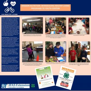 Situation/Objectives: According to the American Heart Association, approximately one in three children and teens are overweight/obese. Childhood obesity is now the number one health concern among parents in the United States. So what is your 4-H program doing to help with this crisis? The Mission Nutrition program is a great way to start introducing youth to the importance of healthy living while teaching them how to prepare healthy AND budget friendly foods for themselves and their families. By using fun, hands-on learning and projects youth are able to learn the skills needed to lead a healthy life as both adolescents and adults. Providing healthy living programs to youth will ultimately contribute to lowering the rate of obesity among America’s youth. As a result of participating, youth will gain knowledge and skills to support healthy lifestyles. Educational Methods: The Mission Nutrition program was a five-day program offered to youth ages 8-12 and funded through a $1,000 grant, provided by UnitedHealth Care, Food Smart Families. Each day the youth were taught one or more lessons using the 4th H for Health curriculum and the Choose Health: Food, Fun, & Fitness curriculum. The program also utilized the 5 Minute Physical Activities for Elementary Students handbook from Learning ZoneXpress. Results: All youth ages 8-12 were encouraged to attend giving us an average attendance of 31 youth each day. The youth were given a pre/posttest to evaluate knowledge gained. Demographics of the program – 65% Caucasian, 4% Indian, and 13% African American, of which 17% were Hispanic. Conclusion: Due to the success of this program, there have been four families from the youth center inquire about joining Sumter County 4-H. A local daycare has also reached out for assistance in teaching their parents the importance of packing healthy lunches for their children.