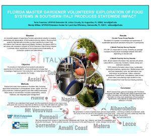 Results: On-site focus group revealed an increase in knowledge and awareness of sustainable agricultural practices. Of the 31 MGV’s who participated in the Food Systems Tour of Southern Italy, 74% (N= 23) responded to a 2 month post-trip survey, revealing an average increase of horticultural knowledge between 68%-88%, depending on the site visit. 100% of the 20 who responded to a 5 month post-trip survey, shared information they learned with others, including other MGV’s, community members, friends, family and extension clientele. They reported sharing information about crops, sustainable horticulture practices, agrotourism, Mediterranean diet and food preparation, wine, and alternative crop techniques via workshops, videos, extension publications, PowerPoints, consultations, plant clinics, phone desk, and planting crops studied on tour. 50% of participants reported an increase in their local food purchasing practices.