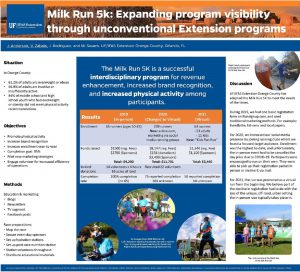 - Situation: In 2016 Orange County reported 62.2% of the adult population had overweight or obesity and 56.9% were inactive or insufficiently active. Middle school and high school youth who had overweight or obesity were significantly lower, however 84% did not meet physical activity recommendations (Department of Health, 2020). Obesity is a risk factor for preventable chronic diseases, and sedentary lifestyles can lead to overweight and obesity. This need gave agents an opportunity to intervene in the family circle to promote physical activity and help prevent the prevalence of obesity. Methods: To address the issues of overweight, obesity, and inactivity, Family and Consumer Sciences agents and 4-H collaborate yearly to host the Milk Run 5K. This event takes place on County office grounds. The Milk Run 5k promotes physical activity while marketing Extension Services. The yearly goal is to increase enrollment and participation, increase the number of physically active residents, raise funds, and increase awareness of Extension. County office grounds and neighboring land provide a one-of-a-kind outdoor trail running experience in an urban setting. This neighboring land was formerly dairy farm land, hence the name of Milk Run 5k. Results: For process data, the FCS/4-H team builds on yearly experiences to ensure marketing and sponsorship, race mapping, and procurement of T-shirts, medals, race day food and beverages are secured in a timely manner. Outcome data is collected from registrants, race completion rates, and funds raised from registration and sponsorships. Impact data is estimated based on intent to change, with individuals completing a post-survey to indicate if they planned to increase weekly physical activity after the Milk Run 5k, and if they would refer others to future Extension races. Conclusion: This program has proven to help increases physical activity which has the long-term potential to positively impact overall obesity rates.