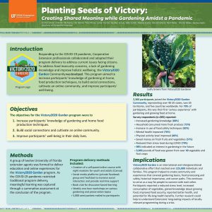 Situation: Responding to the COVID-19 pandemic, Cooperative Extension professionals collaborated and adapted their program delivery to address current issues facing citizens. To address food insecurity concerns, a lack of gardening knowledge, and improve holistic wellbeing, the Victory2020 Garden Community was developed. This program aimed to increase participants knowledge of gardening and home food production techniques, build social connections, cultivate an online community, and improve participants well-being. Methods: The program ran from March 2020 through December 2020 and was open to everyone. Knowledge gain, behavior change, and relevant outcomes were captured through a survey at the conclusion of the program. The program was delivered via an eight module self-paced online course, use of social media, a book club, weekly one-hour workshops, and more than 5,000 hand-packaged seed packets mailed to participants. Results: 2,400 participants joined the Victory2020 Garden Community, representing over 40 US states, two US territories, and five countries worldwide. Survey respondents (n=285) reported the following: Their first ‘serious experience’ with gardening and growing food at home (70%), increased gardening knowledge (88%), consumed more fresh produce (73%), increased use of food safety techniques (82%), mental health improved (76%), physical activity improved (80%), saved money on fruits and vegetables (57%), reduced stress level (79%), an interest in future gardening (98%), and 3,000 pounds of food was grown from over 40 vegetable and fruit crops. Conclusion: The program created a collaborative global network of intergenerational, novice and experienced gardeners that reached over 225,000 individuals and families. This impactful program helped to create community and experiences that covered gardening basics, food processing and safety, historical importance, and career paths. This continues to serve as a way for people to connect with each other locally and across great distances. Further research could help to understand extensions’ long-lasting benefits of locally relevant programming during a crisis.