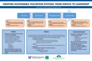 Situation: The Seminole County 4-H program presented multiple opportunities for increased volunteer engagement. Rutledge (2008) presents four stages of Extension professionals with relation to volunteers: service, education, management, leadership. Many volunteers that were currently giving to the Seminole County 4-H program were functioning with a mindset of the service stage. In this stage Agents are seen as “the” program and program capacity is limited to what Agents can do themself. This stage reduces reach, diversity, and opportunity for education and positive youth development. In the education stage, Agents see their role as providing all the expertise needed to run their local program. In the management stage, Agents learn to do things through the work of others. In the leadership stage, the focus is on looking at the system to find new ways to expand the program in content, audience, and quality. Methods: Plans and systems were put in place to move the Seminole County 4-H program from the “service” stage to the “leadership” stage. Intentional recruitment was done to increase the diversity of the 4-H Advisory Committee including organizational representation, lived experience, geography, and age. The diversity of the committee provided new and different ideas. Trainings provided 4-H volunteers the tools and resources to increase knowledge and skills to achieve the program’s mission. Opportunities to practice leadership were also introduced, such as committee chair work and teaching youth in 4-H clubs. Results: These efforts increased the volunteer leadership, stakeholder engagement, and social capital of Seminole County 4-H as indicated through observational data. Strengthened relationships and capacity building for individuals and community organizations to partner with each other and UF/IFAS Extension has contributed to increased human resource development. Conclusion: Moving volunteers and staff from service to leadership creates a diverse and stainable county 4-H program.