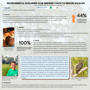 Situation: According to the United States Census, in St. Johns County, from 2010 to 2020, there has been a 44% increase in the number of people per square mile (316.4 to 455.4). One consequence of this development is a decrease in natural lands. Without environmental science education, youth will underappreciate native plants and wildlife. Objective: To motivate youth to engage in wildlife conservation practices. Methods: The six-member Environmental Explorers club met monthly from September—May. A different native or invasive Florida animal was featured using PowerPoints (behavior, tracks, and physical characteristics) and discussions, specimens, and topic-related crafts. Results: Youth were able to name two characteristics of each animal along with whether it was native or invasive. One club member found an orphaned great horned owlet and contacted the local wildlife rehabilitation center. He independently saved his allowance for the five months the owl was in rehabilitation and donated it to the rehabilitation center at the owl’s release. Conclusion: Caring about the environment is an example of the Essential Element of Generosity. Environmentally conscious youth who appreciate wildlife and wild plants care about how other people relate to nature (concern for others) and recognize how wildlife reacts to human impacts (empathy).