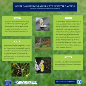 Situation. Sumter County, Florida, is home to a significant part of The Villages, which is identified as one of the largest retirement communities in the country. The newest community of the Villages has become home to many of the newest residents of The Villages who are often from other states or countries and are unaware of Florida’s fragile ecosystem and water resources, including those found in Sumter County. Methods. A free program, WISER Lawns and Landscapes for New Residents, has been offered at two locations each month. This program covers topics designed to educate residents on best management practices for efficiently watering lawns and landscapes, on implementing integrated pest management, and using proper fertilization practices. Improper use of these practices can adversely affect water resources. Residents learn through this workshop how to conserve and protect water resources. Results. The Villages residents responded to a Qualtrics survey (n=174) which documented a change in behavior resulting in potential water savings and other practices which may lead to protection of water resources. As a result of participant changes in water-saving practices (n=100), they demonstrated an estimated water savings of 3,049,913 gallons of water which represents a water savings value of $10,552.20 based on $3.45 per 1,000 gallons. Participants changed behavior related to pesticide use including identifying a pest before spraying (n=47), reading and following the label before applying the product (n=58), and match the correct pesticide for the pest (n=46). As a result of fertilizer changes, participants (n=80) minimize fertilization in the winter months, and some use a slow or controlled release fertilizer on landscape plants (n=56). Conclusion. New residents of The Villages can adopt irrigation, pesticide and fertilization best management practices which lead to significant water conservation and protection.